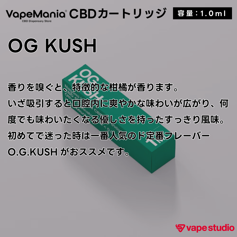 香りを嗅ぐと、特徴的な柑橘が香ります。いざ吸引すると口腔内に爽やかな味わいが広がり、何度でも味わいたくなる優しさを持ったすっきり風味。初めてで迷った時は一番人気のド定番フレーバーO.G.KUSHがおススメです。
