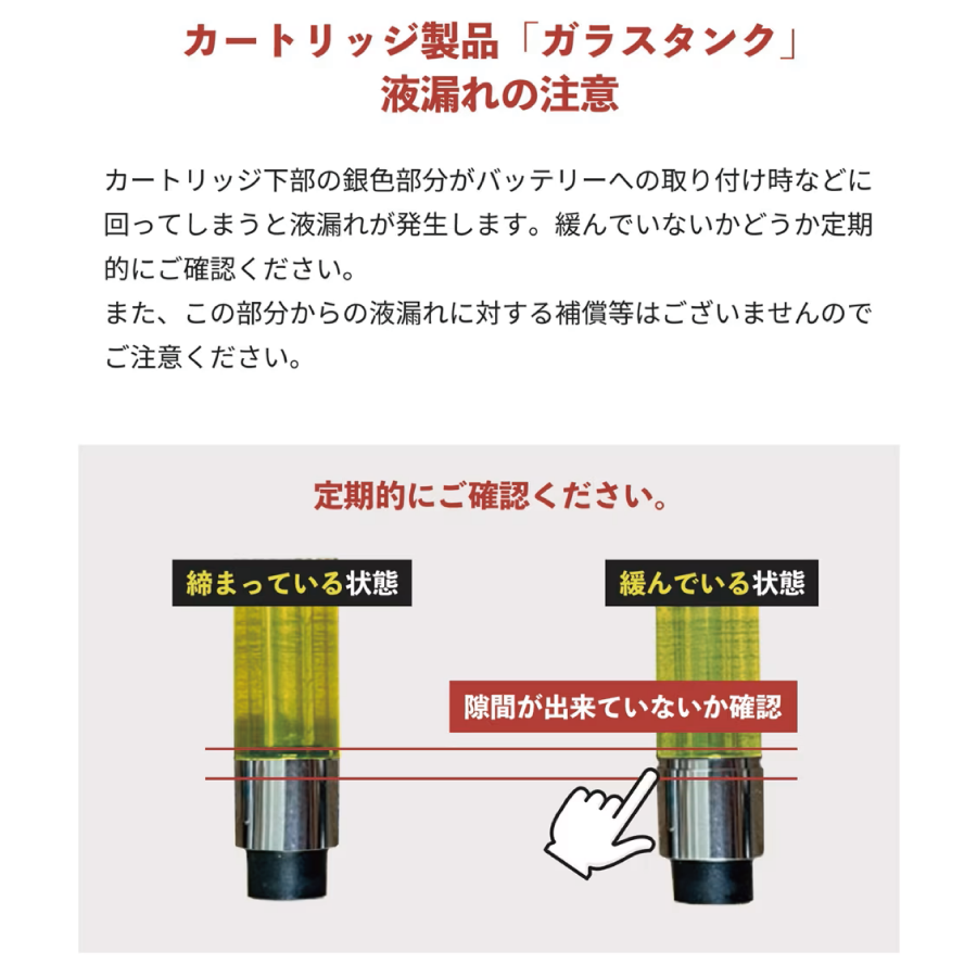 ・若干の結晶化は、ペンバッテリーのプレヒート機能の熱や、ドライヤーの程良い距離からの熱で、解消が可能です。(火傷しない程度の熱温)